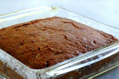 5 Pour out the batter into your prepared cake pan. Place in the middle rack of the 375°F oven and bake for 25-30 minutes, until done. The cake should spring back to the touch, and a toothpick or thin skewer should come out clean after being inserted in various spots in the middle of the cake. Remove the cake from the oven. Let cool for 15 minutes. Then invert to cool completely on a rack.